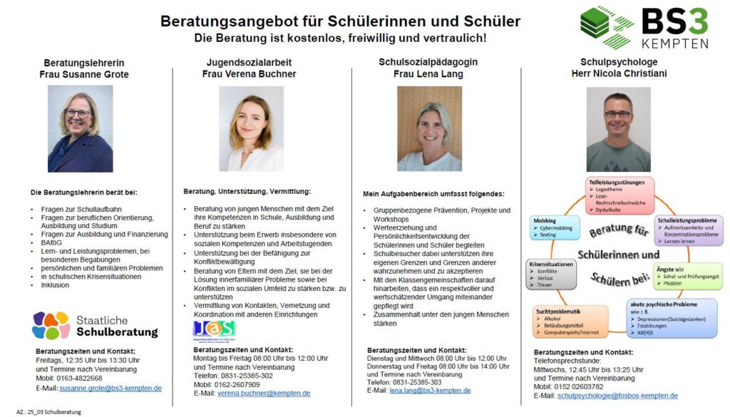 Schulberatung Beratungsangebot hier als PDF downloaden Tagessprecher, Schulsprecher und Verbindungslehrkräfte Tagessprecher, Schülersprecher und Verbindungslehrkräfte hier als PDF downloaden Depressionen / Angststörungen Hilfsangebote Depressionen hier als PDF downloaden Angebote zur berufssprachlichen Förederung Unterstützungsangebote berufssprachliche Förderung hier als PDF downloaden Lorem ipsum dolor sit amet, consectetur adipiscing elit. Ut elit tellus, luctus nec ullamcorper mattis, pulvinar dapibus leo. Gib hier deine Überschrift ein